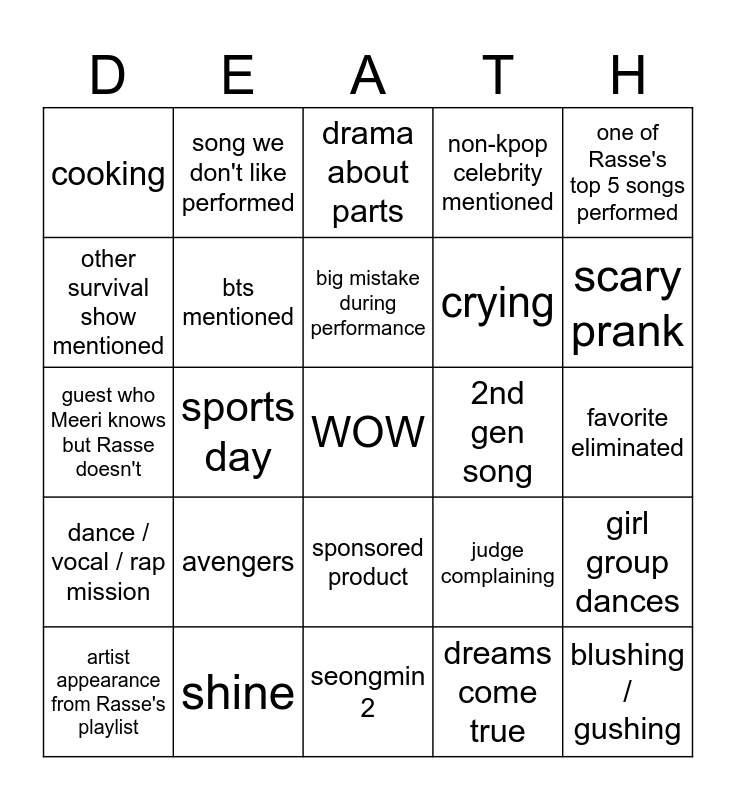 This bingo card has a free space and 24 words: avengers, shine, big mistake during performance, artist appearance from Rasse's playlist, one of Rasse's top 5 songs performed, cooking, other survival show mentioned, song we don't like performed, 2nd gen song, sponsored product, crying, guest who Meeri knows but Rasse doesn't, judge complaining, girl group dances, bts mentioned, dreams come true, favorite eliminated, drama about parts, scary prank, sports day, blushing / gushing, dance / vocal / rap mission, non-kpop celebrity mentioned and seongmin 2.