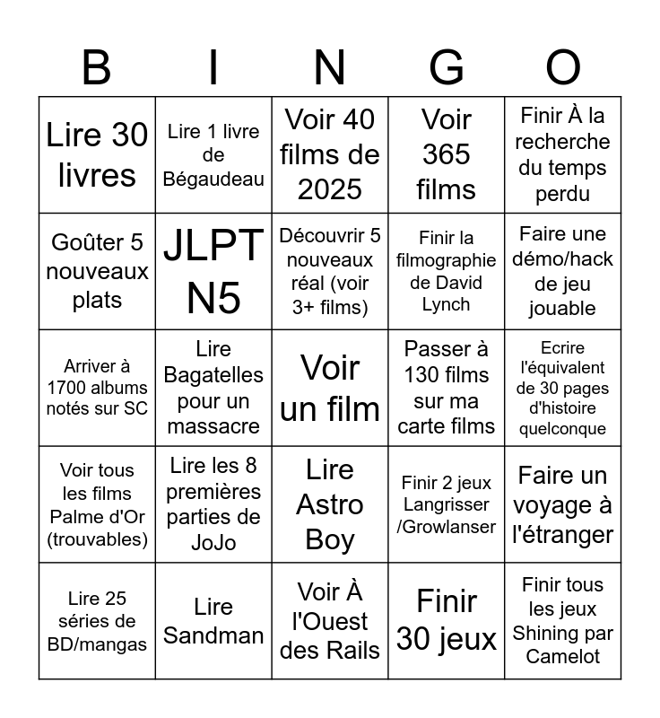 This bingo card has a free space and 24 words: Lire les 8 premières parties de JoJo, Lire Sandman, Découvrir 5 nouveaux réal (voir 3+ films), Lire 25 séries de BD/mangas, Finir À la recherche du temps perdu, Lire 30 livres, Goûter 5 nouveaux plats, Lire 1 livre de Bégaudeau, Passer à 130 films sur ma carte films, Lire Astro Boy, Finir la filmographie de David Lynch, Arriver à 1700 albums notés sur SC, Finir 2 jeux Langrisser /Growlanser, Faire un voyage à l'étranger, JLPT N5, Finir 30 jeux, Ecrire l'équivalent de 30 pages d'histoire quelconque, Voir 40 films de 2025, Faire une démo/hack de jeu jouable, Lire Bagatelles pour un massacre, Finir tous les jeux Shining par Camelot, Voir tous les films Palme d'Or (trouvables), Voir 365 films and Voir À l'Ouest des Rails.