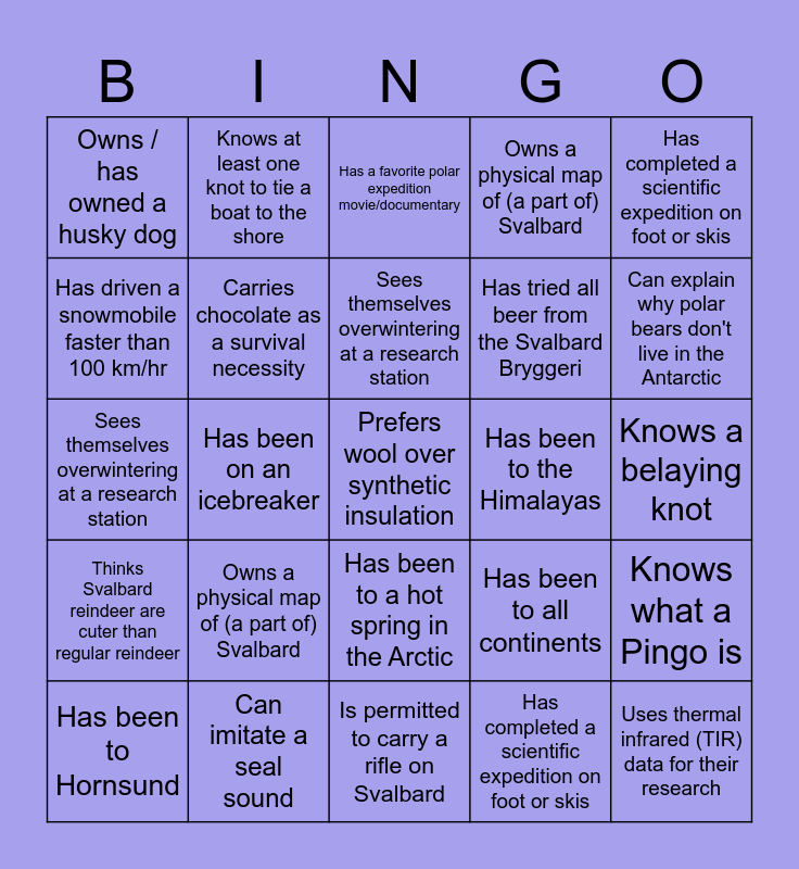 This bingo card has 138 words: Free!, Knows where the city of Tiksi is., Speaks Norwegian fluently, Practices skitouring (Randonnée), Has been above 4000 m, Has been to the Himalayas, Uses thermal infrared (TIR) data for their research, Has flown a drone on Svalbard, Has been to Ny-Alesund, Would like to move to Longyearbyen, Has been on an icebreaker, Has a boat driving license (any country), Has a kayak certification (våttkort), Has been to all countries member of the EFTA (European Free Trade Association, Norway is one of them), Knows how to rescue someone fallen out of a boat (boat manoeuvre), Knows at least one knot to tie a boat to the shore, Knows a belaying knot, Has been to a glacier cave, Has worked for AWI at one point in his life, Knows the mean permafrost temperature at the Bayelva station, Has been to all continents, Knows what a Pingo is, Is permitted to carry a rifle on Svalbard, Can name all species of seals in the Arctic, Knows how to pronounce "Isfjord Radio" correctly, Owns a physical map of (a part of) Svalbard, Prefers snowshoes over skis, Has slept in an ice cave, Knows the name of a glacier on Svalbard, Has been to a hot spring in the Arctic, Prefers wool over synthetic insulation, Has seen the southern lights (aurora australis), Has tasted seal or whale meat, Has completed a scientific expedition on foot or skis, Thinks polar bears are overrated compared to walruses, Can tell the difference between sea ice and glacial ice by sight, Has studied sea ice or permafrost, Has been closer to the North Pole than 82°N, Speaks more than one Scandinavian language, Has used a satellite phone, Thinks penguins would be a great addition to the Arctic ecosystem, Knows how to navigate using the stars, Carries chocolate as a survival necessity, Believes the Arctic tern is the coolest Arctic bird, Has completed a Polar Plunge (swimming in freezing waters), Has a favorite polar expedition movie/documentary, Uses ice cores for their research, Can explain why polar bears don't live in the Antarctic, Collects rocks or ice samples as souvenirs, Has more than five layers of clothing on right now (only layers covering the legs and torso count), Has read an Arctic-themed book / novel, Thinks Svalbard reindeer are cuter than regular reindeer, Knows the name of at least one Svalbard trapper cabin, Can differentiate between aurora borealis and aurora australis in photos, Has worked on a research vessel in the Arctic, Sees themselves overwintering at a research station, Wants to become a professor, Has tried all beer from the Svalbard Bryggeri, Lives in a country with a currency other than Kroner / Zloty, Has been to Bjornøya, Has been to Jan Mayen, Can imitate a seal sound, Touched a polar bear, Has photographed an Arctic fox, Owns / has owned a husky dog, Can start a fire without a lighter/matches, Went to a SIOS training course, Created a NetCDF file of their data and uploaded it to the SIOS portal, Has driven a snowmobile faster than 100 km/hr, Knows where the city of Tiksi is, Speaks Norwegian fluently, Practices skitouring (Randonnée), Has been above 4000 m, Has been to the Himalayas, Uses thermal infrared (TIR) data for their research, Has flown a drone on Svalbard, Has been to Ny-Alesund, Would like to move to Longyearbyen, Has been on an icebreaker, Has a boat driving license (any country), Has a kayak certification (våttkort), Has been to all countries member of the EFTA (European Free Trade Association, Norway is one of them), Knows how to rescue someone fallen out of a boat (boat manoeuvre), Knows at least one knot to tie a boat to the shore, Knows a belaying knot, Has been to a glacier cave, Has worked for AWI at one point in his life, Knows the mean permafrost temperature at the Bayelva station, Has been to all continents, Knows what a Pingo is, Is permitted to carry a rifle on Svalbard, Can name all species of seals in the Arctic, Knows how to pronounce "Van Mijenfjorden " correctly, Has been to Hornsund, Owns a physical map of (a part of) Svalbard, Prefers snowshoes over skis, Has slept in an ice cave, Knows the name of a glacier on Svalbard, Has been to a hot spring in the Arctic, Prefers wool over synthetic insulation, Has seen the southern lights (aurora australis), Has tasted seal or whale meat, Has completed a scientific expedition on foot or skis, Thinks polar bears are overrated compared to walruses, Can tell the difference between sea ice and glacial ice by sight, Has studied sea ice or permafrost, Has been closer to the North Pole than 82°N, Speaks more than one Scandinavian language, Has used a satellite phone, Thinks penguins would be a great addition to the Arctic ecosystem, Knows how to navigate using the stars, Carries chocolate as a survival necessity, Believes the Arctic tern is the coolest Arctic bird, Has completed a Polar Plunge (swimming in freezing waters), Has a favorite polar expedition movie/documentary, Uses ice cores for their research, Can explain why polar bears don't live in the Antarctic, Collects rocks or ice samples as souvenirs, Has more than five layers of clothing on right now (only layers covering the legs and torso count), Has read an Arctic-themed book / novel, Thinks Svalbard reindeer are cuter than regular reindeer, Knows the name of at least one Svalbard trapper cabin, Can differentiate between aurora borealis and aurora australis in photos, Has worked on a research vessel in the Arctic, Sees themselves overwintering at a research station, Wants to become a professor, Has tried all beer from the Svalbard Bryggeri, Lives in a country with a currency other than Kroner / Zloty, Has been to Bjornøya, Has been to Jan Mayen, Can imitate a seal sound, Touched a polar bear, Has photographed an Arctic fox, Owns / has owned a husky dog, Can start a fire without a lighter/matches, Went to a SIOS training course, Created a NetCDF file of their data and uploaded it to the SIOS portal and Has driven a snowmobile faster than 100 km/hr.