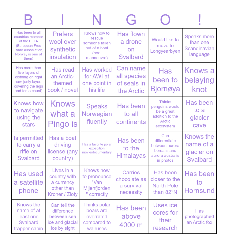 This bingo card has 69 words: Knows where the city of Tiksi is, Speaks Norwegian fluently, Practices skitouring (Randonnée), Has been above 4000 m, Has been to the Himalayas, Uses thermal infrared (TIR) data for their research, Has flown a drone on Svalbard, Has been to Ny-Alesund, Would like to move to Longyearbyen, Has been on an icebreaker, Has a boat driving license (any country), Has a kayak certification (våttkort), Has been to all countries member of the EFTA (European Free Trade Association, Norway is one of them), Knows how to rescue someone fallen out of a boat (boat manoeuvre), Knows at least one knot to tie a boat to the shore, Knows a belaying knot, Has been to a glacier cave, Has worked for AWI at one point in his life, Knows the mean permafrost temperature at the Bayelva station, Has been to all continents, Knows what a Pingo is, Is permitted to carry a rifle on Svalbard, Can name all species of seals in the Arctic, Knows how to pronounce "Van Mijenfjorden " correctly, Has been to Hornsund, Owns a physical map of (a part of) Svalbard, Prefers snowshoes over skis, Has slept in an ice cave, Knows the name of a glacier on Svalbard, Has been to a hot spring in the Arctic, Prefers wool over synthetic insulation, Has seen the southern lights (aurora australis), Has tasted seal or whale meat, Has completed a scientific expedition on foot or skis, Thinks polar bears are overrated compared to walruses, Can tell the difference between sea ice and glacial ice by sight, Has studied sea ice or permafrost, Has been closer to the North Pole than 82°N, Speaks more than one Scandinavian language, Has used a satellite phone, Thinks penguins would be a great addition to the Arctic ecosystem, Knows how to navigate using the stars, Carries chocolate as a survival necessity, Believes the Arctic tern is the coolest Arctic bird, Has completed a Polar Plunge (swimming in freezing waters), Has a favorite polar expedition movie/documentary, Uses ice cores for their research, Can explain why polar bears don't live in the Antarctic, Collects rocks or ice samples as souvenirs, Has more than five layers of clothing on right now (only layers covering the legs and torso count), Has read an Arctic-themed book / novel, Thinks Svalbard reindeer are cuter than regular reindeer, Knows the name of at least one Svalbard trapper cabin, Can differentiate between aurora borealis and aurora australis in photos, Has worked on a research vessel in the Arctic, Sees themselves overwintering at a research station, Wants to become a professor, Has tried all beer from the Svalbard Bryggeri, Lives in a country with a currency other than Kroner / Zloty, Has been to Bjornøya, Has been to Jan Mayen, Can imitate a seal sound, Touched a polar bear, Has photographed an Arctic fox, Owns / has owned a husky dog, Can start a fire without a lighter/matches, Went to a SIOS training course, Created a NetCDF file of their data and uploaded it to the SIOS portal and Has driven a snowmobile faster than 100 km/hr.