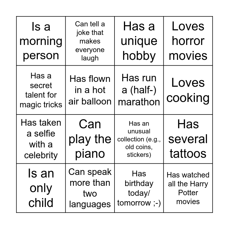 This bingo card has 29 words: Has a cat, Has traveled to more than 10 countries, Has several tattoos, Is wearing a watch tonight, Is a morning person, Has a unique hobby, Has run a (half-) marathon, Is vegan, Can speak more than two languages, Is left-handed, Has birthday today/ tomorrow ;-), Is an only child, Has a sibling with the same name as you, Can juggle, Can play the piano, Can wiggle their ears, Always sleeps with the heating on, Has watched all the Harry Potter movies, Has a secret talent for magic tricks, Has an unusual collection (e.g., old coins, stickers), Can do a handstand, Is afraid of spiders, Has taken a selfie with a celebrity, Has flown in a hot air balloon, Loves horror movies, Can tell a joke that makes everyone laugh, Is wearing something pink tonight, Loves cooking and Enjoys playing video games.