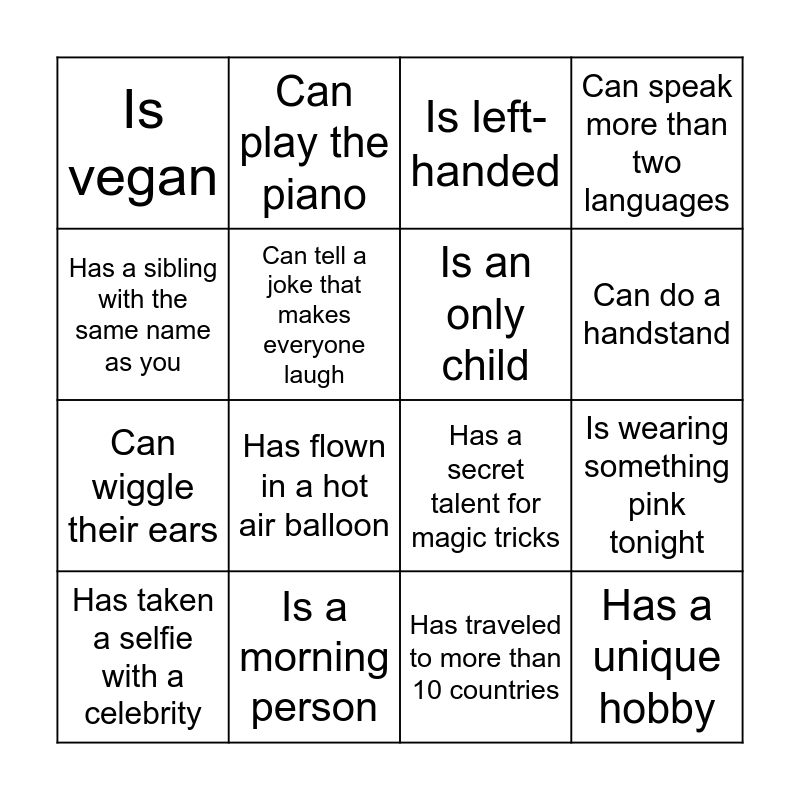 This bingo card has 29 words: Loves horror movies, Loves cooking, Is wearing something pink tonight, Is wearing a watch tonight, Is vegan, Is left-handed, Is an only child, Is afraid of spiders, Is a morning person, Has watched all the Harry Potter movies, Has traveled to more than 10 countries, Has taken a selfie with a celebrity, Has several tattoos, Has run a (half-) marathon, Has flown in a hot air balloon, Has birthday today/ tomorrow ;-), Has an unusual collection (e.g., old coins, stickers), Has a unique hobby, Has a sibling with the same name as you, Has a secret talent for magic tricks, Has a cat, Enjoys playing video games, Can wiggle their ears, Can tell a joke that makes everyone laugh, Can speak more than two languages, Can play the piano, Can juggle, Can do a handstand and Always sleeps with the heating on.