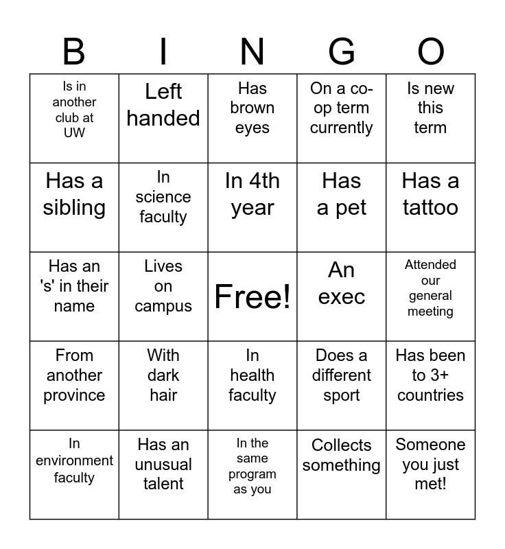 This bingo card has a free space and 39 words: In math faculty, In engineering faculty, In arts faculty, In science faculty, In environment faculty, In health faculty, In 4th year, Paddled in the summer, Is new this term, From another province, Lives on campus, On a co-op term currently, Someone you just met!, Attended our general meeting, An exec, With dark hair, With glasses, Is in another club at UW, Did swimming, Does a different sport, Has a sibling, In the same program as you, Has a pet, Has a tattoo, Plays an instrument, Likes to read, Has lived in a different country, Speaks another language, Has broken a bone, Left handed, Can touch their toes, Had/has braces, Has brown eyes, Has an unusual talent, Collects something, Born on the same month as you, Has been to 3+ countries, Has an 's' in their name and Likes lego.