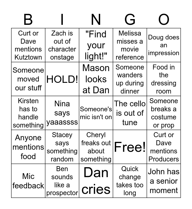 This bingo card has 25 words: Stacey says something random, Dan cries, Mason looks at Dan, Mic feedback, Doug does an impression, Curt or Dave mentions Kutztown, Someone moved our stuff, Zach is out of character onstage, The cello is out of tune, Cheryl freaks out about something, Someone wanders up during dinner, Kirsten has to handle something, Free!, Curt or Dave mentions Producers, HOLD!, John has a senior moment, Someone breaks a costume or prop, "Find your light!", Food in the dressing room, Nina says yaaassss, Someone's mic isn't on, Ben sounds like a prospector, Anyone mentions food, Melissa misses a movie reference and Quick change takes too long.