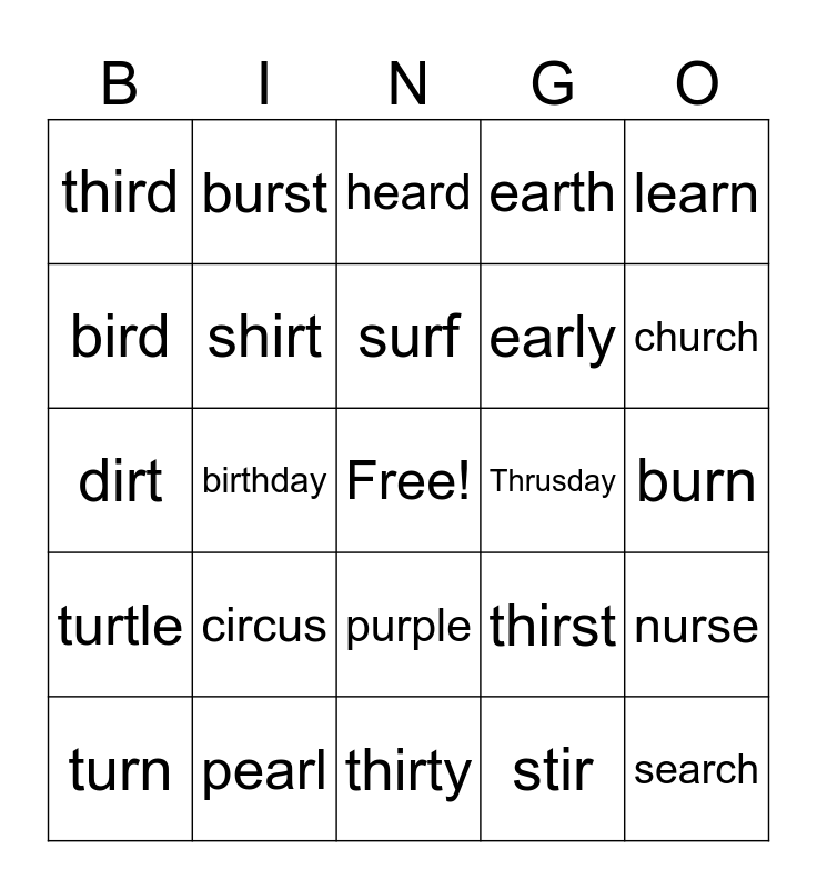 This bingo card has a free space and 24 words: circus, pearl, surf, turn, learn, third, bird, burst, Thrusday, purple, early, dirt, thirst, nurse, shirt, stir, burn, heard, church, birthday, search, turtle, earth and thirty.