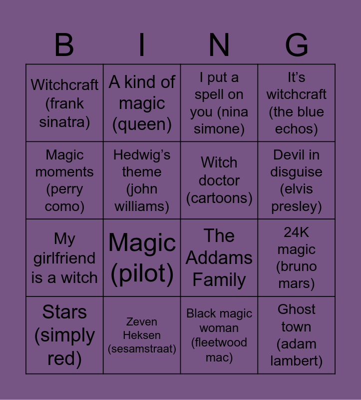 This bingo card has 22 words: Zeven Heksen (sesamstraat), Witchy woman (eagles), A kind of magic (queen), Magic (coldplay), Hedwig’s theme (john williams), Witch doctor (cartoons), Witchcraft (frank sinatra), I put a spell on you (nina simone), The Addams Family, Ghost town (adam lambert), My girlfriend is a witch, It’s witchcraft (the blue echos), She’s a rainbow (rolling stones), Hex girls (moon sisters), Black magic woman (fleetwood mac), We’re off to see the wizard, 24K magic (bruno mars), Stars (simply red), Magic (pilot), Magic moments (perry como), Devil in disguise (elvis presley) and Ghost town (the specials).
