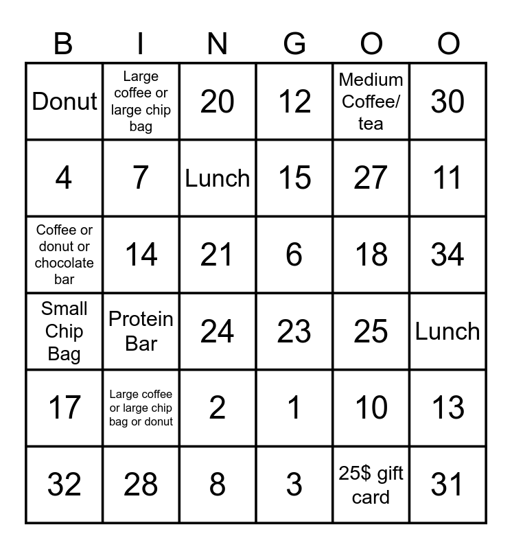 This bingo card has 36 words: 1, 2, 3, 4, Small Chip Bag, 6, 7, 8, Medium Coffee/ tea, 10, 11, 12, 13, 14, 15, Donut, 17, 18, Coffee or donut or chocolate bar, 20, 21, Protein Bar, 23, 24, 25, Large coffee or large chip bag, 27, 28, Lunch, 30, 31, 32, Lunch, 34, Large coffee or large chip bag or donut and 25$ gift card.