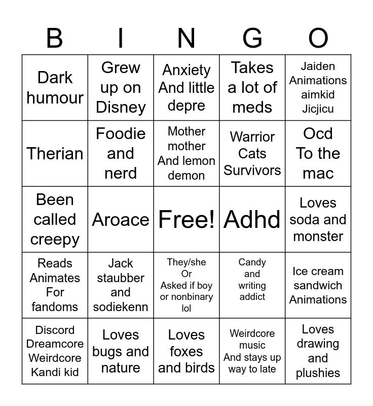 This bingo card has a free space and 24 words: Discord Dreamcore Weirdcore Kandi kid, Jack staubber and sodiekenn, Mother mother And lemon demon, Weirdcore music And stays up way to late, Jaiden Animations aimkid Jicjicu, Dark humour, Grew up on Disney, Anxiety And little depre, Adhd, Loves soda and monster, Been called creepy, Foodie and nerd, Candy and writing addict, Ice cream sandwich Animations, Therian, Loves bugs and nature, Loves foxes and birds, Takes a lot of meds, Ocd To the mac, Reads Animates For fandoms, Aroace, They/she Or Asked if boy or nonbinary lol, Warrior Cats Survivors and Loves drawing and plushies.