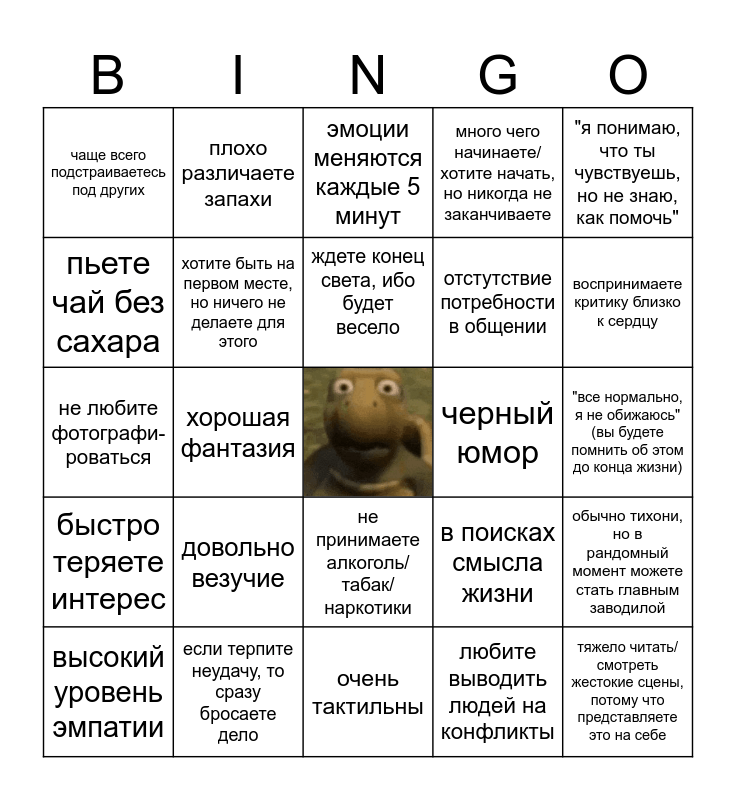 This bingo card has a free space and 24 words: довольно везучие, если терпите неудачу, то сразу бросаете дело, ждете конец света, ибо будет весело, высокий уровень эмпатии, "я понимаю, что ты чувствуешь, но не знаю, как помочь", чаще всего подстраиваетесь под других, пьете чай без сахара, плохо различаете запахи, черный юмор, не принимаете алкоголь/табак/наркотики, отстутствие потребности в общении, не любите фотографи-роваться, в поисках смысла жизни, обычно тихони, но в рандомный момент можете стать главным заводилой, хотите быть на первом месте, но ничего не делаете для этого, любите выводить людей на конфликты, "все нормально, я не обижаюсь" (вы будете помнить об этом до конца жизни), эмоции меняются каждые 5 минут, воспринимаете критику близко к сердцу, хорошая фантазия, тяжело читать/смотреть жестокие сцены, потому что представляете это на себе, быстро теряете интерес, много чего начинаете/хотите начать, но никогда не заканчиваете and очень тактильны.