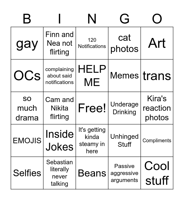 This bingo card has a free space and 29 words: Selfies, Plots for stories, Cam and Nikita flirting, Trauma dumping, gay, 120 Notifications, complaining about said notifications, Inside Jokes, Underage Drinking, Sebastian literally never talking, Kira's reaction photos, Cool stuff, Beans, Passive aggressive arguments, trans, crapping on cis men (come on), It's getting kinda steamy in here, EMOJIS, Art, so much drama, Unhinged Stuff, We're all emotional wrecks, Memes, OCs, cat photos, Finn and Nea not flirting, Compliments, HELP ME and Fun Facts.