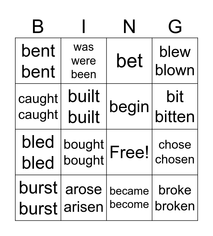 This bingo card has 21 words: arose arisen, awoke awoken, was were been, beat beat, became become, begin, bent bent, bet, Free!, bit bitten, bled bled, blew blown, broke broken, brought brought, built built, burned burnt, burst burst, bought bought, caught caught, chose chosen and cling.