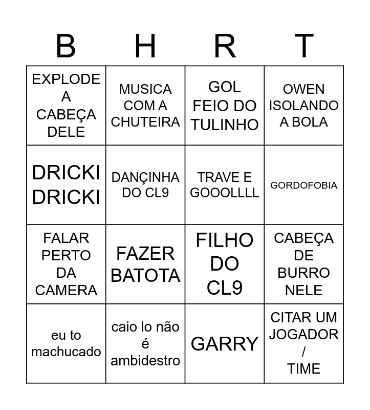 This bingo card has 16 words: eu to machucado, caio lo não é ambidestro, GOL FEIO DO TULINHO, OWEN ISOLANDO A BOLA, DRICKI DRICKI, MUSICA COM A CHUTEIRA, FILHO DO CL9, CABEÇA DE BURRO NELE, EXPLODE A CABEÇA DELE, DANÇINHA DO CL9, GARRY, GORDOFOBIA, FALAR PERTO DA CAMERA, FAZER BATOTA, TRAVE E GOOOLLLL and CITAR UM JOGADOR / TIME.