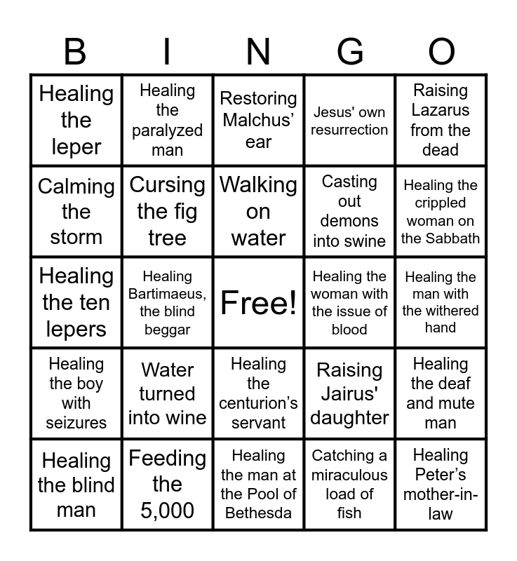 This bingo card has a free space and 24 words: Water turned into wine, Feeding the 5,000, Walking on water, Healing the blind man, Raising Lazarus from the dead, Healing the leper, Calming the storm, Healing the paralyzed man, Healing the woman with the issue of blood, Healing the centurion’s servant, Casting out demons into swine, Healing the ten lepers, Raising Jairus' daughter, Healing the deaf and mute man, Cursing the fig tree, Catching a miraculous load of fish, Healing the man with the withered hand, Restoring Malchus’ ear, Healing the crippled woman on the Sabbath, Healing Bartimaeus, the blind beggar, Healing Peter’s mother-in-law, Healing the boy with seizures, Jesus' own resurrection and Healing the man at the Pool of Bethesda.