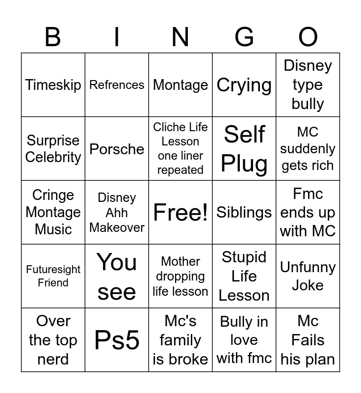 This bingo card has a free space and 24 words: You see, Ps5, Cliche Life Lesson one liner repeated, Over the top nerd, Disney type bully, Timeskip, Surprise Celebrity, Refrences, Siblings, Mother dropping life lesson, Self Plug, Cringe Montage Music, Stupid Life Lesson, Unfunny Joke, Porsche, Bully in love with fmc, Fmc ends up with MC, Montage, MC suddenly gets rich, Disney Ahh Makeover, Mc Fails his plan, Futuresight Friend, Crying and Mc's family is broke.