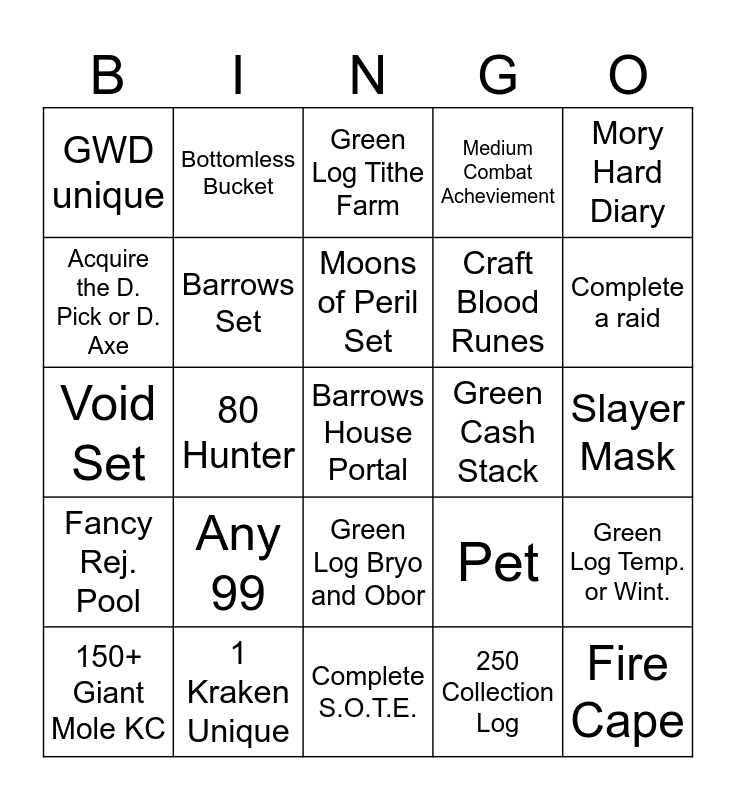 This bingo card has 25 words: Any 99, Complete S.O.T.E., Moons of Peril Set, 150+ Giant Mole KC, Mory Hard Diary, GWD unique, Acquire the D. Pick or D. Axe, Bottomless Bucket, Green Cash Stack, Green Log Bryo and Obor, Craft Blood Runes, Void Set, Pet, Green Log Temp. or Wint., Barrows Set, Fire Cape, Slayer Mask, Green Log Tithe Farm, Complete a raid, 80 Hunter, Barrows House Portal, 1 Kraken Unique, Fancy Rej. Pool, Medium Combat Acheviement and 250 Collection Log.