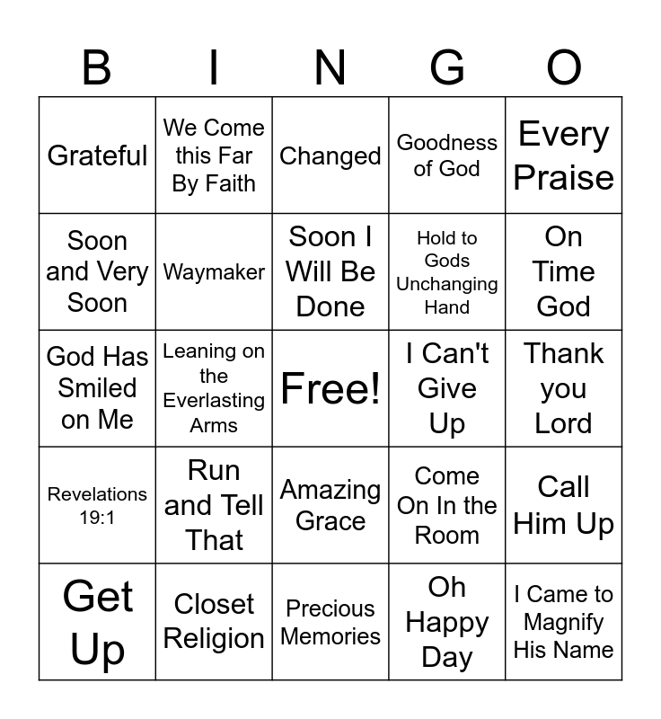 This bingo card has a free space and 70 words: Smile, Thank you Lord, I Am Blessed, The Presence of the Lord is Here, Closet Religion, My Trubute, Goodness of God, Never Would Have Made It, Every Praise, If it Had Not Been for the Lord, Call Him Up, My Soul Has Been Anchored in the Lord, Grateful, Changed, You Are My Strength, Leaning on the Everlasting Arms, Amazing Grace, Hold to Gods Unchanging Hand, The Center of My Joy, Revelations 19:1, I Can't Give Up, Come On In the Room, On Time God, Order My Steps, There’s A Leak in This Old Building, When I Rose This Morning, I Won't Complain, Down Through the Years, Oh Happy Day, Lord Help Me to Hold Out, We Come this Far By Faith, God Is, Pass Me Not, Oh it is Jesus, He’s an On Time God, The Battle is Not Yours, Sweeping through the City, Precious Lord Take My Hand, Something About the Name Jesus, Soon and Very Soon, Jesus, I Love Calling Your Name, Run and Tell That, I Came to Magnify His Name, I Love to Praise Him, Break Every Chain, Waymaker, Get Up, Awesome, Shakles, Stomp, Stand, My Life is in Your Hands, Lord Do It For me, Because of Who You Are, Precious Memories, Have You Been Tried in The Fire, Soon I Will Be Done, A Charge To Keep I Have, Mary, Don't You Weep, Walk Around Heaven, God Has Smiled on Me, Goin'Up Yonder, God is Trying to Tell You Something, That's When You Bless Me, No Charge, Long As I Got King Jesus, Take Me to the King, Trouble in My Way, Jesus Promised Me a Home Over There and Rough Side of the Mountain.