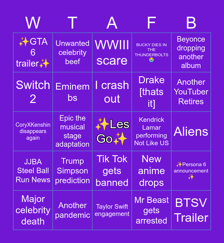 This bingo card has a free space and 24 words: Trump Simpson prediction, Another pandemic, I crash out, Major celebrity death, Beyonce dropping another album, ✨️GTA 6 trailer✨️, Switch 2, Unwanted celebrity beef, Kendrick Lamar performing Not Like US, Tik Tok gets banned, Drake [thats it], CoryXKenshin disappears again, New anime drops, ✨️Persona 6 announcement ✨️, Eminem bs, Mr Beast gets arrested, Aliens, WWIII scare, Another YouTuber Retires, Epic the musical stage adaptation, BTSV Trailer, JJBA Steel Ball Run News, BUCKY DIES IN THE THUNDERBOLTS 😭 and Taylor Swift engagement.