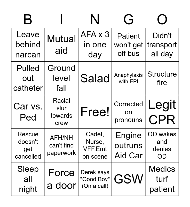 This bingo card has a free space and 24 words: Sleep all night, AFH/NH can't find paperwork, Salad, GSW, Didn't transport all day, Leave behind narcan, Mutual aid, AFA x 3 in one day, Corrected on pronouns, Legit CPR, Car vs. Ped, Ground level fall, Engine outruns Aid Car, OD wakes and denies OD, Pulled out catheter, Force a door, Derek says "Good Boy" (On a call), Patient won't get off bus, Structure fire, Rescue doesn't get cancelled, Racial slur towards crew, Cadet, Nurse, VFF,Emt on scene, Anaphylaxis with EPI and Medics turf patient.