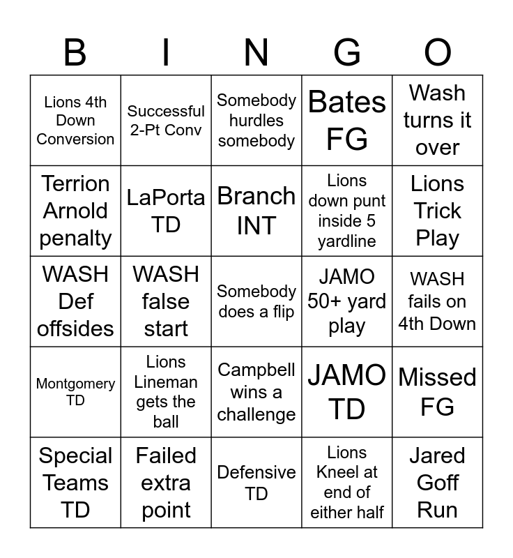 This bingo card has 36 words: Free!, Amon-Ra TD, Gibbs TD, LaPorta TD, JAMO TD, Montgomery TD, Branch INT, Joseph INT, Wash turns it over, Lions DEF Sack, WASH false start, Bates FG, Gibbs 40+ yard run, JAMO 50+ yard play, Lions Trick Play, Lions 4th Down Conversion, Jared Goff Run, Lions Lineman gets the ball, Somebody does a flip, Somebody hurdles somebody, WASH fails on 4th Down, Missed FG, Failed extra point, Special Teams TD, Defensive TD, Successful 2-Pt Conv, WASH Def offsides, Lions score 30+ points, Lions down punt inside 5 yardline, Terrion Arnold penalty, Brian Branch penalty, Anzalone Slams Thor's Hammer, Lions Kneel at end of either half, Campbell wins a challenge, Amon-Ra Headstand and Other Lion TD (Wright, Patrick, etc).