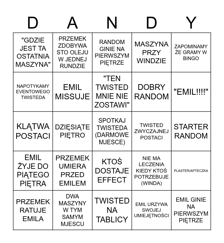 This bingo card has 1 images, a free space and 52 words: EMIL KRZYCZY, EMIL GINIE NA PIERWSZYM PIĘTRZE, NAPOTYKAMY MAIN TWISTEDA, EMIL URZYWA SWOJEJ UMIEJĘTNOŚCI, PRZEMEK UMIERA PRZED EMILEM, RANDOM DO NAS DOŁĄCZA, PRZEMEK ZDOBYWA STO OLEJU W JEDNEJ RUNDZIE, BLACKOUT, NAPOTYKAMY EVENTOWEGO TWISTEDA, MAPA KUCHNIA, EMIL MISSUJE, PRZEMEK SIĘ ZAGAPIA, PLASTER/APTECZKA, NIE MA LECZENIA KIEDY KTOŚ POTRZEBUJE (WINDA), JESTEŚMY NA INNYCH SERWERACH, PRZEMEK RATUJE EMILA, "TEN TWISTED MNIE NIE ZOSTAWI", TWISTED ZWYCZAJNEJ POSTACI, PRZEMEK ROBI WSZYSTKIE MASZYNY, ZAPOMINAMY ŻE GRAMY W BINGO, DZIĘSIĄTE PIĘTRO, PRZEMEK MA JEDEN HP W WINDZIE, DOBRY RANDOM, "GDZIE JEST TA OSTATNIA MASZYNA", TWISTED ŚLEPY, DWA MASZYNY W TYM SAMYM MJESCU, "MOGŁEM TEGO NIE ROBIĆ", >:( TWISTED, SOLO RUN, "EMIL!!!!", OBYDWA TWISTEDY KOGOŚ GONIĄ, "ZARAZ ZGINĘ", EMIL NIE ZOSTAJE UDERZONY PRZEZ JEDNO PIĘTRO, SKLEP DANDY NIE MA NIC DOBREGO, LAGI, ZAPOMINAMY O MIEJSCU NA BINGO, MASZYNA PRZY WINDZIE, TWISTED NA TABLICY, RANDOM GINIE NA PIERWSZYM PIĘTRZE, RZATKI ITEM, KTOŚ GINIĘ SPECIALNIE, INTERAKCJA, STARTER RANDOM, KTOŚ GINIĘ PRZED WINDĄ, ZGRUPOWANIE NA SPAWNIE, KTOŚ DOSTAJE EFFECT, RANDOM MA SKINA, CZEKANIE NA STAMINE, KLĄTWA POSTACI, EMIL ŻYJE DO PIĄTEGO PIĘTRA, RANDOM PRZYPROWADZA TWISTEDA and RANDOM WYCHODZI W ŚRODKU RUNDY.