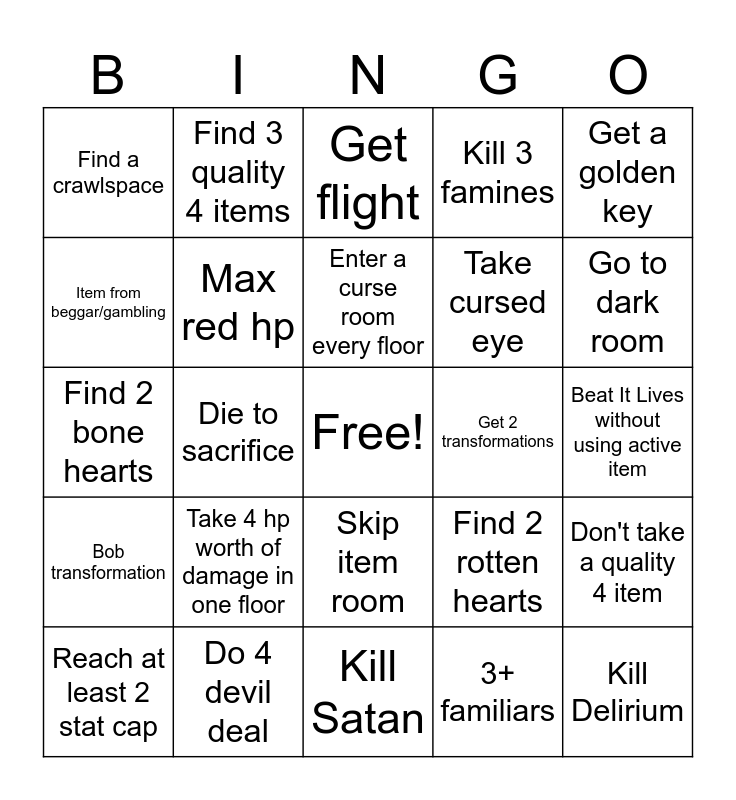 This bingo card has a free space and 24 words: Take 4 hp worth of damage in one floor, Do 4 devil deal, Enter a curse room every floor, Reach at least 2 stat cap, Get a golden key, Find a crawlspace, Item from beggar/gambling, Find 3 quality 4 items, Get 2 transformations, Skip item room, Take cursed eye, Find 2 bone hearts, Find 2 rotten hearts, Don't take a quality 4 item, Max red hp, 3+ familiars, Beat It Lives without using active item, Get flight, Go to dark room, Die to sacrifice, Kill Delirium, Bob transformation, Kill 3 famines and Kill Satan.