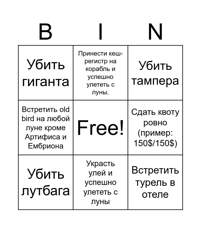 This bingo card has a free space and 39 words: Убить паука, Убить блоху, Убить бабуина, Убить лутбага, Найти золотой слиток, Купить джетпак, Украсть улей и успешно улететь с луны, Забрать аппаратус и успешно улететь с луны, Встретить турель в отеле, Встретить Пианиста, Убить мимика, Встретить old bird на любой луне кроме Артифиса и Ембриона, Убить наткракера, Убить бракена, Сдать 2 яйца на Гордионе за один раз, Встретить Джестера на любой Т2 луне, Eclipced минимум на 5 лунах одновременно в терминале, Убить гиганта, Убить слепую собаку, Умереть от призрачной девочки, Сдать квоту ровно (пример: 150$/150$), Пересдать квоту минимум в 5 раз больше чем нужно., Иметь минимум 1600$ денег на покупки., Встретить дворецкого на любой т2 луне., Убить дворецкого., Убить монстра в комплексе яйцом., Убить монстра в комплексе ножом дворецкого., Убить наткракера из дробовика., Убить дворецкого ножом дворецкого., Принести кеш-регистр на корабль и успешно улететь с луны., Иметь минимум 5 коробок с пивом на корабле., Плохая погода на всех лунах в терминале., Убить тампера, Открыть подарок, Держать 4 ключа в инвентаре., Взорвать мину и выжить., Молния убивает монстра на ваших глазах., Иметь минимум 10 двуручных предметов на корабле. and Иметь одновременно минимум 1 фонарик, 1 pro-фонарик, 1 лопату, 1 рацию,1 tzp, 1 zapGun и 1 джетпак.