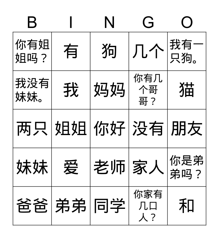 This bingo card has a free space and 24 words: 爱, 弟弟, 妈妈, 爸爸, 我有一只狗。, 你有姐姐吗?, 我没有妹妹。, 有, 没有, 老师, 你有几个哥哥?, 两只, 家人, 你是弟弟吗?, 我, 你家有几口人?, 朋友, 狗, 猫, 姐姐, 和, 妹妹, 几个 and 同学.