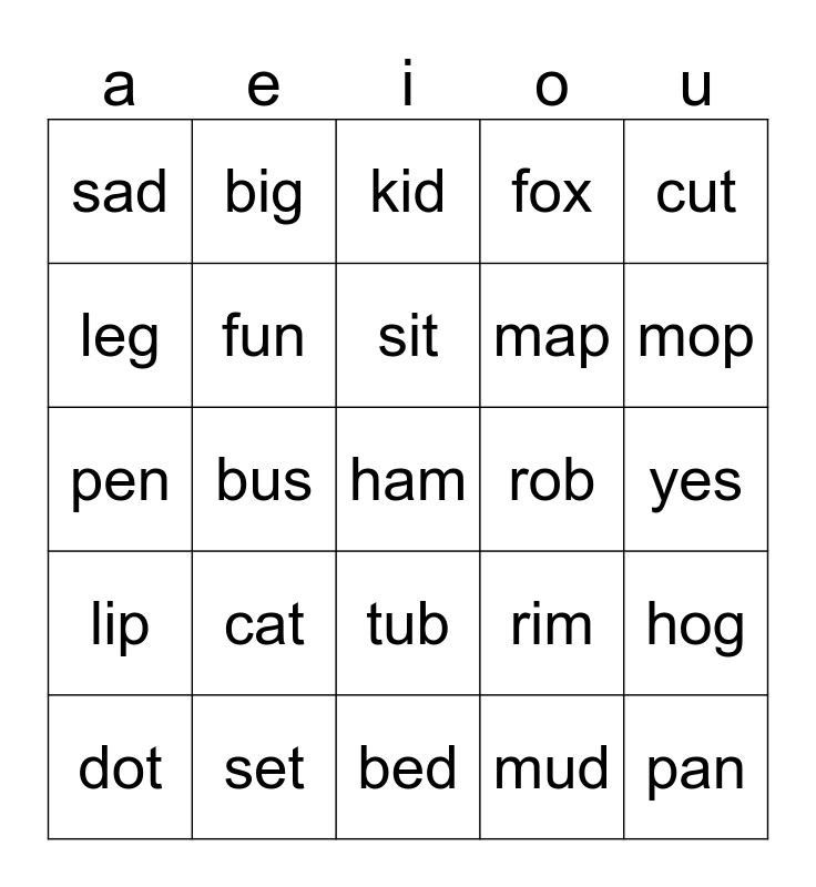 This bingo card has 25 words: cat, bed, sit, dot, cut, sad, leg, big, rob, tub, map, pen, rim, hog, fun, pan, yes, kid, mop, bus, ham, set, lip, fox and mud.