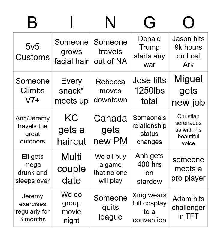 This bingo card has a free space and 24 words: Multi couple date, We do group movie night, Rebecca moves downtown, Jeremy exercises regularly for 3 months, Jason hits 9k hours on Lost Ark, 5v5 Customs, Someone Climbs V7+, Someone grows facial hair, Someone's relationship status changes, We all buy a game that no one will play, Jose lifts 1250lbs total, Anh/Jeremy travels the great outdoors, Anh gets 400 hrs on stardew, someone meets a pro player, Every snack* meets up, Xing wears full cosplay to a convention, Christian serenades us with his beautiful voice, Someone travels out of NA, Miguel gets new job, KC gets a haircut, Adam hits challenger in TFT, Eli gets mega drunk and sleeps over, Donald Trump starts any war and Someone quits league.