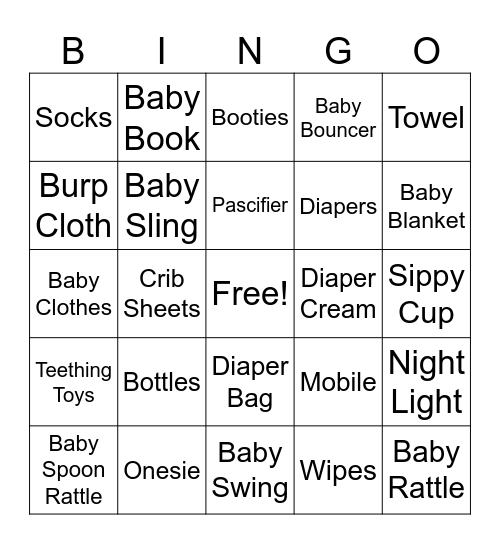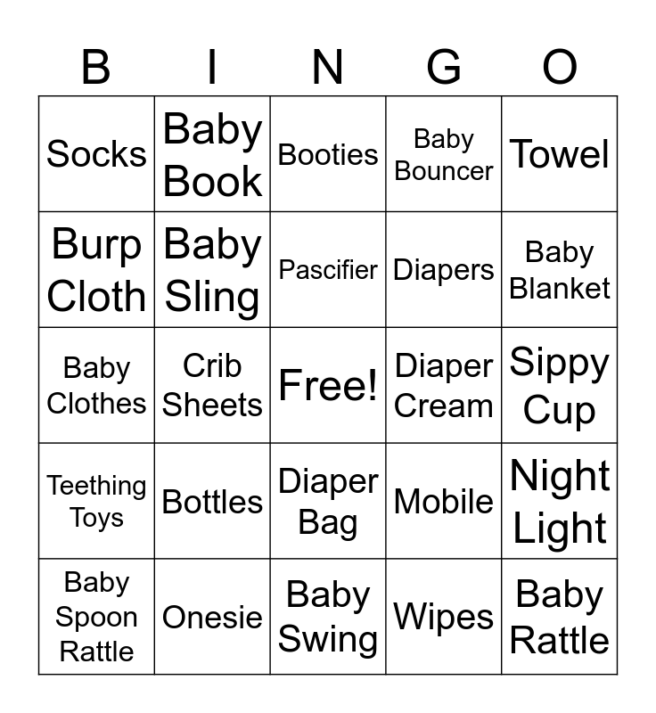 This bingo card has a free space and 24 words: Bottles, Onesie, Pascifier, Baby Spoon Rattle, Towel, Socks, Burp Cloth, Baby Book, Diaper Cream, Diaper Bag, Diapers, Baby Clothes, Mobile, Night Light, Baby Sling, Wipes, Sippy Cup, Booties, Baby Blanket, Crib Sheets, Baby Rattle, Teething Toys, Baby Bouncer and Baby Swing.