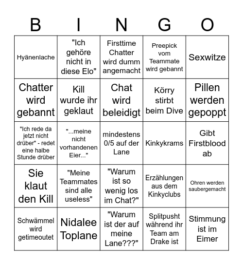 This bingo card has a free space and 24 words: "Meine Teammates sind alle useless", Nidalee Toplane, Chat wird beleidigt, Schwämmel wird getimeoutet, Sexwitze, Hyänenlache, Chatter wird gebannt, "Ich gehöre nicht in diese Elo", Kinkykrams, "Warum ist so wenig los im Chat?", Körry stirbt beim Dive, "Ich rede da jetzt nicht drüber" - redet eine halbe Stunde drüber, Erzählungen aus dem Kinkyclubs, Ohren werden saubergemacht, Kill wurde ihr geklaut, Splitpusht während ihr Team am Drake ist, Gibt Firstblood ab, Firsttime Chatter wird dumm angemacht, Pillen werden gepoppt, "...meine nicht vorhandenen Eier...", Stimmung ist im Eimer, Sie klaut den Kill, Preepick vom Teammate wird gebannt and "Warum ist der auf meine Lane???".