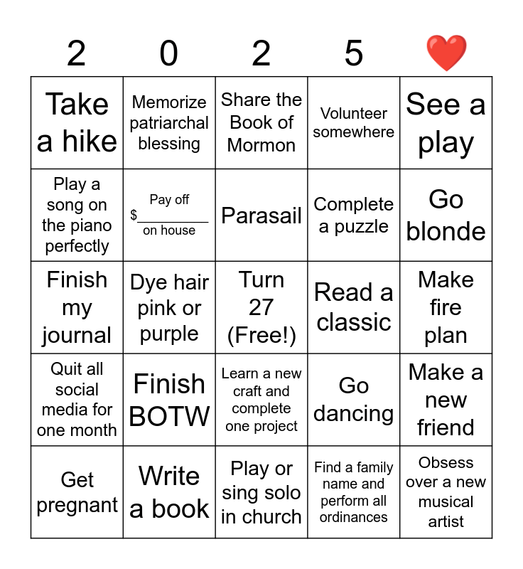 This bingo card has a free space and 24 words: Finish BOTW, Write a book, Parasail, Get pregnant, See a play, Take a hike, Play a song on the piano perfectly, Memorize patriarchal blessing, Read a classic, Learn a new craft and complete one project, Complete a puzzle, Finish my journal, Go dancing, Make a new friend, Pay off $__________ on house, Find a family name and perform all ordinances, Make fire plan, Share the Book of Mormon, Go blonde, Dye hair pink or purple, Obsess over a new musical artist, Quit all social media for one month, Volunteer somewhere and Play or sing solo in church.