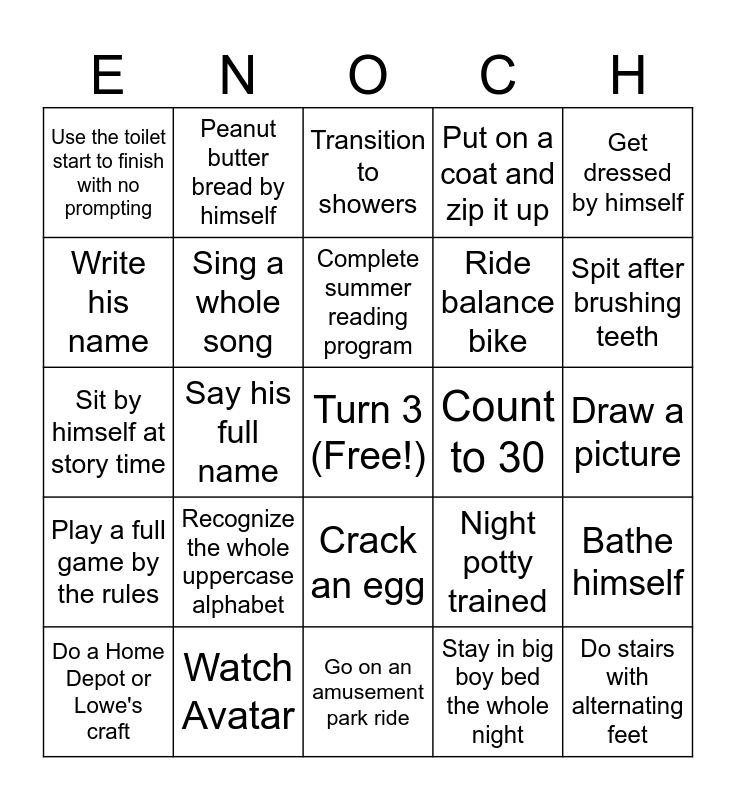 This bingo card has a free space and 24 words: Recognize the whole uppercase alphabet, Watch Avatar, Complete summer reading program, Do a Home Depot or Lowe's craft, Get dressed by himself, Use the toilet start to finish with no prompting, Write his name, Peanut butter bread by himself, Count to 30, Crack an egg, Ride balance bike, Sit by himself at story time, Night potty trained, Bathe himself, Sing a whole song, Stay in big boy bed the whole night, Draw a picture, Transition to showers, Spit after brushing teeth, Say his full name, Do stairs with alternating feet, Play a full game by the rules, Put on a coat and zip it up and Go on an amusement park ride.