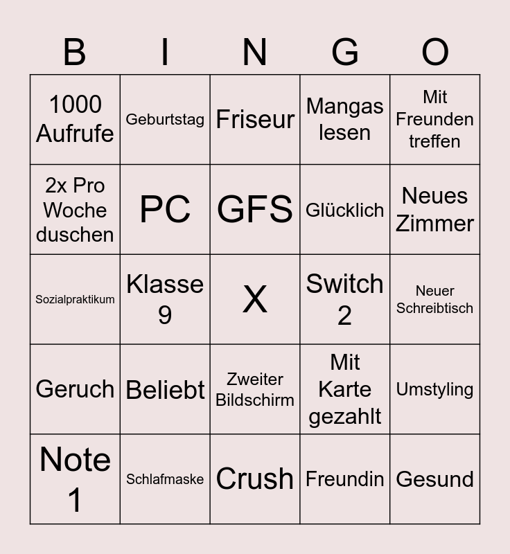 This bingo card has a free space and 24 words: Beliebt, Schlafmaske, GFS, Note 1, Mit Freunden treffen, 1000 Aufrufe, 2x Pro Woche duschen, Geburtstag, Switch 2, Zweiter Bildschirm, Glücklich, Sozialpraktikum, Mit Karte gezahlt, Umstyling, PC, Freundin, Neuer Schreibtisch, Friseur, Neues Zimmer, Klasse 9, Gesund, Geruch, Mangas lesen and Crush.
