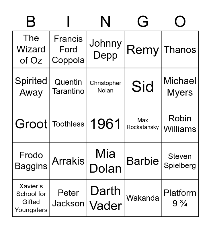 This bingo card has 60 words: Avatar (2009), Peter Jackson, Jennifer Lawrence, Frodo Baggins, Wakanda, HAL 9000, Quentin Tarantino, Boo, Sid, Scar, Remy, Toy Story, Spirited Away, Humphrey Bogart, Alfred Hitchcock, The Wizard of Oz, 1961, Thanos, Brachiosaurus, Christopher Nolan, Max Rockatansky, Johnny Depp, Xavier’s School for Gifted Youngsters, Steven Spielberg, Computer-Generated Imagery, Matt Damon and Ben Affleck, Ruby Red, MGM (Metro-Goldwyn-Mayer), Michael Myers, The Overlook Hotel, Pennywise, The DeLorean, Parasite, You don’t talk about Fight Club, Francis Ford Coppola, Arnold Schwarzenegger, Whiplash, Toothless, Jack-Jack, Groot, Benedict Cumberbatch, Arrakis, Robin Williams, Fantastic Mr. Fox, Barbie, Dead Poets Society, Uncut Gems, The Blair Witch Project, Everything Everywhere All At Once, Mia Dolan, Darth Vader, Once Upon a Time in Hollywood, The Driver, The Barden Bellas, McLovin, Hogwarts, Toyota Supra, Hedwig, Platform 9 ¾ and Daniel Craig.