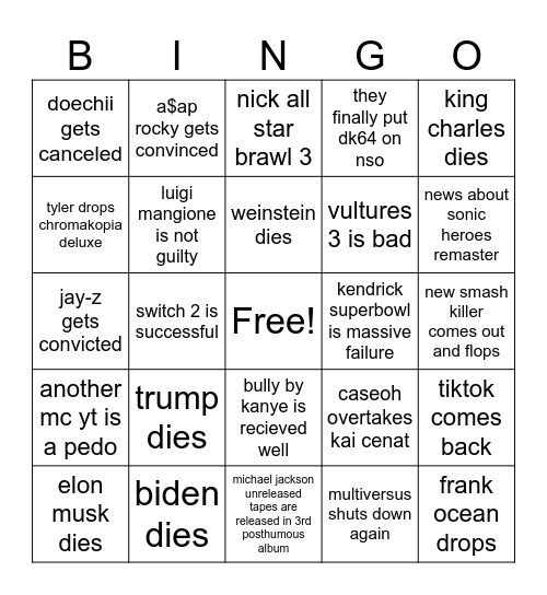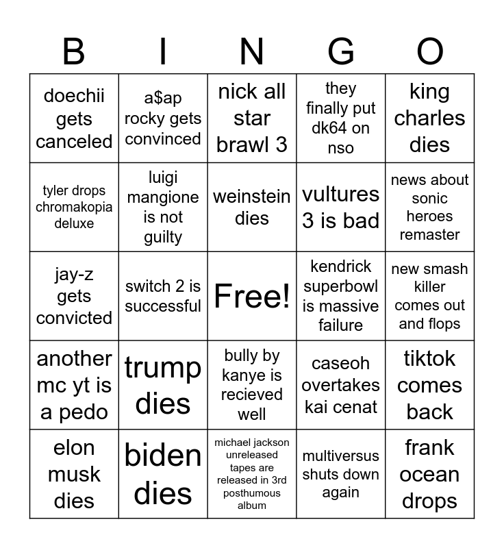 This bingo card has a free space and 24 words: trump dies, biden dies, weinstein dies, elon musk dies, king charles dies, doechii gets canceled, tyler drops chromakopia deluxe, a$ap rocky gets convinced, kendrick superbowl is massive failure, bully by kanye is recieved well, vultures 3 is bad, jay-z gets convicted, caseoh overtakes kai cenat, tiktok comes back, luigi mangione is not guilty, multiversus shuts down again, new smash killer comes out and flops, nick all star brawl 3, news about sonic heroes remaster, switch 2 is successful, frank ocean drops, another mc yt is a pedo, they finally put dk64 on nso and michael jackson unreleased tapes are released in 3rd posthumous album.