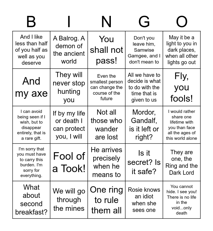 This bingo card has 25 words: Fool of a Took!, One ring to rule them all, Even the smallest person can change the course of the future, What about second breakfast?, May it be a light to you in dark places, when all other lights go out, And I like less than half of you half as well as you deserve, And my axe, A Balrog. A demon of the ancient world, Mordor, Gandalf, is it left or right?, He arrives precisely when he means to, All we have to decide is what to do with the time that is given to us, I can avoid being seen if I wish, but to disappear entirely, that is a rare gift., Is it secret? Is it safe?, They are one, the Ring and the Dark Lord, They will never stop hunting you, You cannot hide. I see you! There is no life in the void...only death, I would rather share one lifetime with you than face all the ages of this world alone, You shall not pass!, Fly, you fools!, If by my life or death I can protect you, I will, Not all those who wander are lost, We will go through the mines, I'm sorry that you must have to carry this burden. I'm sorry for everything., Don't you leave him, Samwise Gamgee, and I don't mean to and Rosie knows an idiot when she sees one.