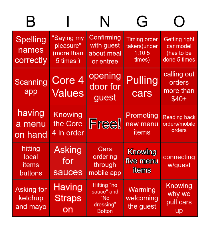 This bingo card has a free space and 24 words: Asking for sauces, Having Straps on, opening door for guest, Asking for ketchup and mayo, Getting right car model (has to be done 5 times, Spelling names correctly, Scanning app, "Saying my pleasure"(more than 5 times ), Promoting new menu items, Cars ordering through mobile app, Pulling cars, having a menu on hand, Knowing five menu items, connecting w/guest, Core 4 Values, Warming welcoming the guest, Reading back orders/mobile orders, Confirming with guest about meal or entree, calling out orders more than $40+, Knowing the Core 4 in order, Knowing why we pull cars up, hitting local items buttons, Timing order takers(under 1:10 5 times) and Hitting "no sauce" and "No dressing" Botton.