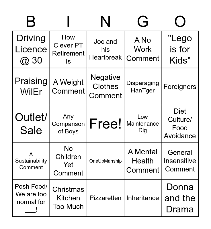 This bingo card has a free space and 36 words: Bullshit Health Advice, Money/ Cheaper Here, Joc Demands Something, A Weight Comment, A Mental Health Comment, A Sustainability Comment, Negative Clothes Comment, PetGoo, "Lego is for Kids", Jochems Birthday, Any Comparison of Boys, A No Work Comment, Bought *Houses*, Low Maintenance Dig, Foreigners, Driving Licence @ 30, Mari and Football, No Children Yet Comment, Donna and the Drama, Joc and his Heartbreak, Diet Culture/ Food Avoidance, General Insensitive Comment, Christmas Kitchen Too Much, Posh Food/ We are too normal for ___!, Pizzaretten, How Clever PT Retirement Is, Outlet/ Sale, Cost of Groceries, Disparaging HanTger, Praising WilEr, Preferential Treatment, Panda Put Down, Inheritance, OneUpManship, Turkey for Hols and Zielig Joc.