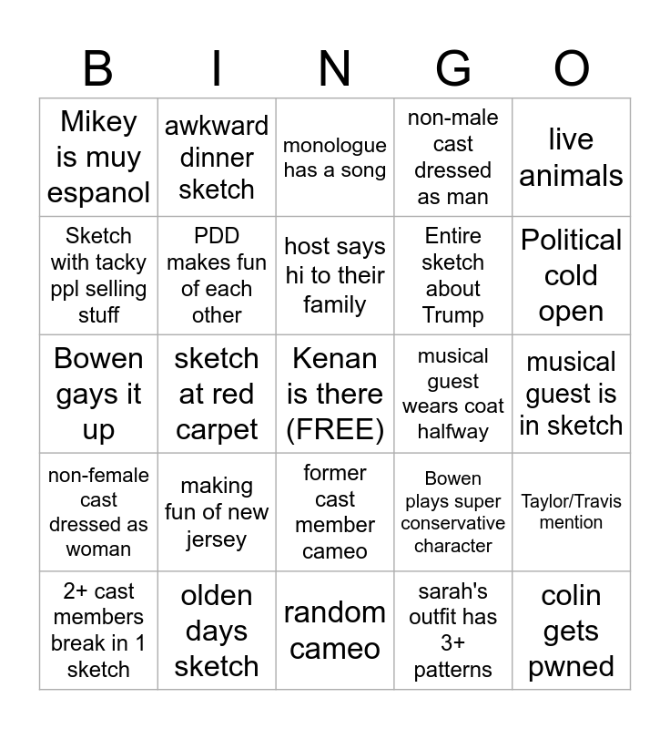 This bingo card has a free space and 24 words: making fun of new jersey, olden days sketch, host says hi to their family, 2+ cast members break in 1 sketch, live animals, Mikey is muy espanol, Sketch with tacky ppl selling stuff, awkward dinner sketch, musical guest wears coat halfway, former cast member cameo, Entire sketch about Trump, Bowen gays it up, Bowen plays super conservative character, Taylor/Travis mention, PDD makes fun of each other, sarah's outfit has 3+ patterns, musical guest is in sketch, monologue has a song, Political cold open, sketch at red carpet, colin gets pwned, non-female cast dressed as woman, non-male cast dressed as man and random cameo.