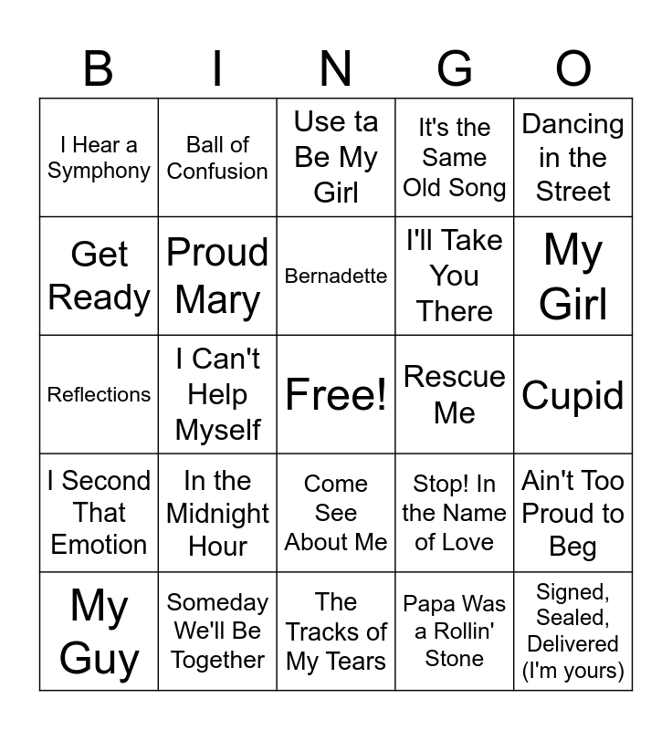 This bingo card has a free space and 64 words: ABC, Ain't No Mountain High Enough, Ain't Nothing Like the Real Thing, Ain't Too Proud to Beg, Baby I Need Your Loving, Baby Love, Ball of Confusion, Band of Gold, Bernadette, Chain Gang, Come See About Me, Could It Be I'm Falling in Love, Cupid, Dancing in the Street, Everyday People, Get Ready, I Can't Help Myself, I Hear a Symphony, I'll Be Around, I'll Take You There, In the Midnight Hour, I Second That Emotion, It's the Same Old Song, It's Your Thing, It Takes Two, I Want You Back, Jimmy Mack, Just My Imagination, Land of 1000 Dances, Let's Get It On, (Love is like a) Heat Wave, Love Train, Mr. Big Stuff, Mustang Sally, My Girl, My Guy, Nowhere to Run, Papa Was a Rollin' Stone, Please Mr. Postman, Proud Mary, Reflections, Rescue Me, Respect, Shop Around, Shotgun, Signed, Sealed, Delivered (I'm yours), Someday We'll Be Together, Soul Man, Stop! In the Name of Love, The Tears of a Clown, Think, This Old Heart of Mine, The Tracks of My Tears, Try a Little Tenderness, Twistin' the Night Away, Uptight (Everything's Alright), Use ta Be My Girl, The Way You Do the Things You Do, Where Did Our Love Go, Will You Love Me Tomorrow, You Can't Hurry Love, You Keep Me Hangin' On, (Your love keeps lifting me) Higher and Higher and You've Really Got a Hold on Me.