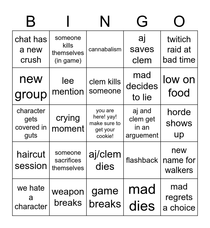 This bingo card has a free space and 28 words: kidnapping, weapon breaks, clem kills someone, mad dies, twitich raid at bad time, chat has a new crush, lee mention, game breaks, aj and clem get in an arguement, new name for walkers, character gets covered in guts, crying moment, flashback, mad regrets a choice, new group, gun runs out of bullets, aj/clem dies, aj saves clem, low on food, we hate a character, someone kills themselves (in game), someone we knows gets bit, mad decides to lie, horde shows up, haircut session, someone sacrifices themselves, cannabalism and main character plot armour.