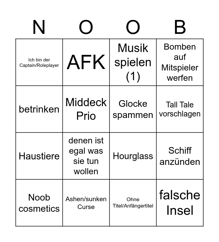 This bingo card has 44 words: kein Botschafter, Noob cosmetics, random Anker-drops, an Insel geankert bleiben, Angeln, keine Mission, Musik spielen (1), Orchester (2), betrinken, Kiddie, Bomben auf Mitspieler werfen, Ashen/sunken Curse, Rock! 10/10, Da Blind (Rock 10/10), nicht reparieren, Piratenlegende, was wollen alle tun, Hourglass, Raids, denen ist egal was sie tun wollen, AFK, Why?, Im Ernst: WHY?, Ich bin der Captain/Roleplayer, Chaos bei beitreten, Ohne Titel/Anfängertitel, Geistfreunde, Missionsbrett, keine kommunikation, falsche Insel, sinnlos rumfahren/stehen, kein Helm, NPC, Essen verbrennen, Schiff anzünden, FREE, Cannons durchladen, Immer Boarder, Tall Tale vorschlagen, Middeck Prio, Haustiere, Idiotenflagge, Glocke spammen and JOKER.