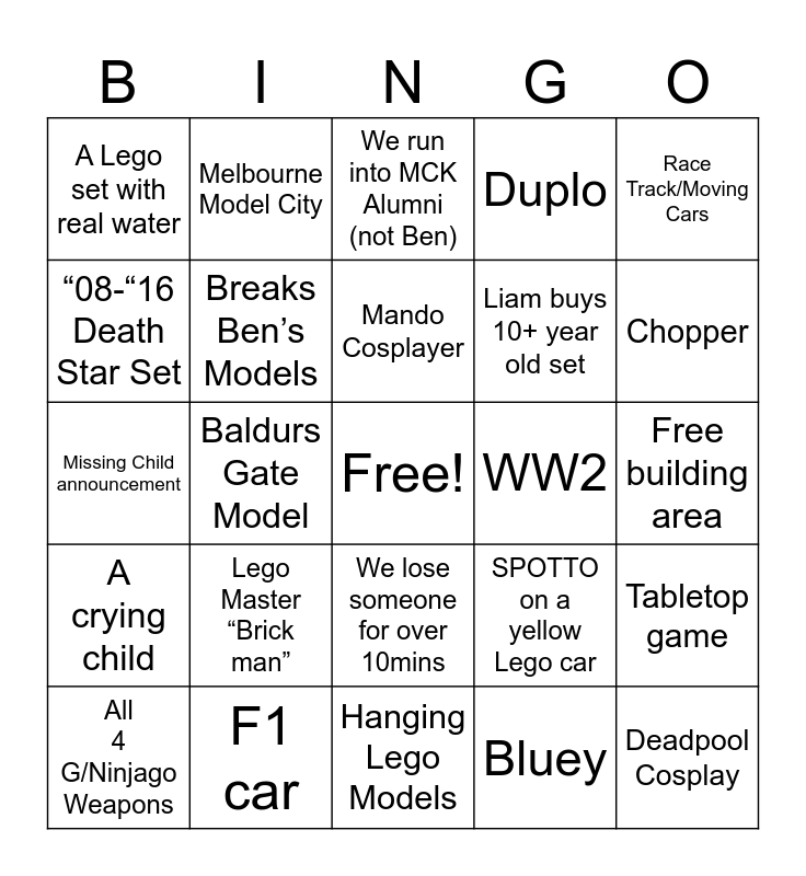 This bingo card has a free space and 24 words: All 4 G/Ninjago Weapons, Lego Master “Brick man”, Mando Cosplayer, Bluey, Race Track/Moving Cars, A Lego set with real water, Melbourne Model City, We run into MCK Alumni (not Ben), WW2, Free building area, Missing Child announcement, Breaks Ben’s Models, SPOTTO on a yellow Lego car, Tabletop game, “08-“16 Death Star Set, F1 car, Hanging Lego Models, Duplo, Chopper, A crying child, Baldurs Gate Model, We lose someone for over 10mins, Liam buys 10+ year old set and Deadpool Cosplay.