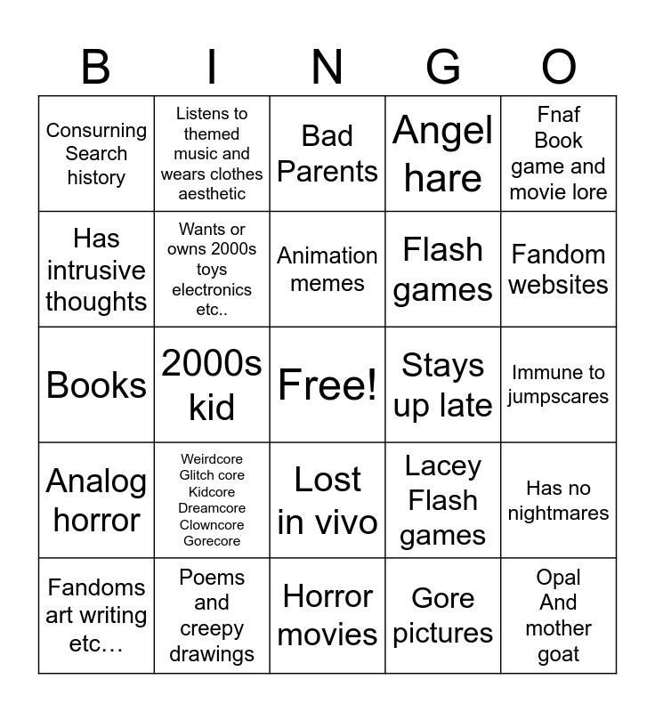 This bingo card has a free space and 24 words: Weirdcore Glitch core Kidcore Dreamcore Clowncore Gorecore, Poems and creepy drawings, Animation memes, Fandoms art writing etc…, Fnaf Book game and movie lore, Consurning Search history, Has intrusive thoughts, Listens to themed music and wears clothes aesthetic, Stays up late, Lost in vivo, Flash games, Books, Lacey Flash games, Has no nightmares, Wants or owns 2000s toys electronics etc.., Gore pictures, Immune to jumpscares, Bad Parents, Fandom websites, 2000s kid, Opal And mother goat, Analog horror, Angel hare and Horror movies.