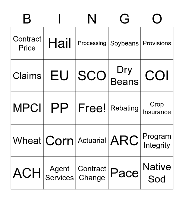 This bingo card has a free space and 66 words: Acreage, 20 20 Rule, Sales Closing, Program Integrity, Loss Credits, Agent Training, Hail, ECO, SCO, Civil Rights, Actuarial, QA, Crop Insurance, Provisions, Endorsements, Claims, PP, Contract Price, Canola, Dry Beans, Corn, Wheat, Soybeans, Hemp, Barley, Dry Peas, Sugar Beets, New Breaking, Native Sod, Trigger Yield, ACH, Quality, Cover Crops, Coverage Analyzer, ARC, Agent Services, Written Agreemens, MPCI, Pace, RMA, EU, OU, Rebating, Premier Service, Insurance Period, CIH, COI, Soil Survey, Progress Report, Sunflowers, Quoting, 65%, Acreage Reporting, Flow Charts, County Boundary, First Crop, Second Crop, Policy Holder, Processing, Contract Change, Review Types, 85%, RHIS, Northern Division, Disclaimer and Division Manager.