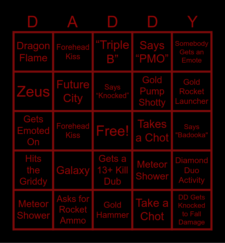 This bingo card has a free space and 39 words: Dragon Flame, Zeus, Rosa Nebula, Future City, Meteor Shower, Gets a 13+ Kill Dub, Says “Knocked”, Gets Jumpscared, Somebody Gets an Emote, Hits the Griddy, Forehead Kiss, Says “PMO”, DD Gets Knocked to Fall Damage, Says "Badooka", Takes a Chot, Galaxy, Interstellar, Dragon Flame, Universe, Meteor Shower, Zeus, Gold Hammer, Gold Pump Shotty, Gold Rocket Launcher, Gets a Dub, Says “Knocked”, Gets Jumpscared, Somebody Gets an Emote, Hits the Griddy, Forehead Kiss, Says “PMO”, DD Cries, “Triple B”, Asks for Rocket Ammo, Take a Chot, Passes to Fall Damage, Diamond Duo Activity, Gets Emoted On and "I'm Better!".