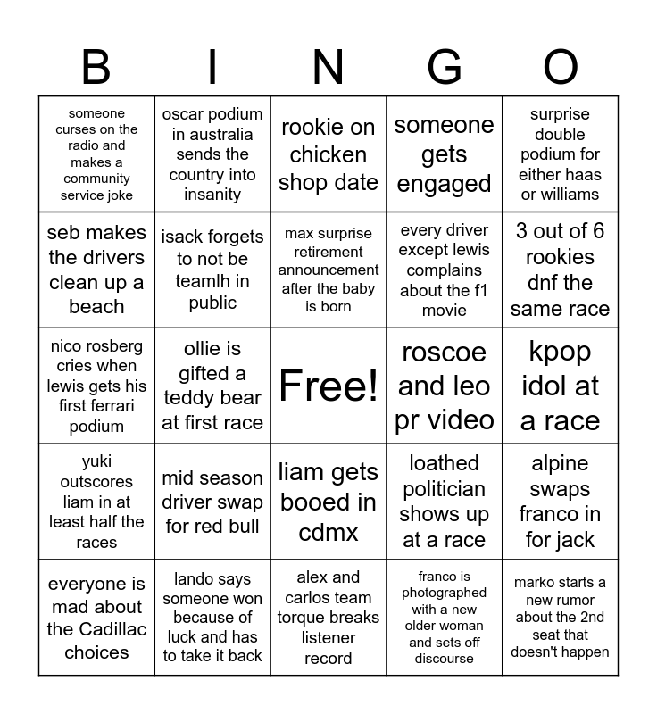 This bingo card has a free space and 24 words: mid season driver swap for red bull, lando says someone won because of luck and has to take it back, max surprise retirement announcement after the baby is born, everyone is mad about the Cadillac choices, surprise double podium for either haas or williams, someone curses on the radio and makes a community service joke, seb makes the drivers clean up a beach, oscar podium in australia sends the country into insanity, roscoe and leo pr video, liam gets booed in cdmx, every driver except lewis complains about the f1 movie, nico rosberg cries when lewis gets his first ferrari podium, loathed politician shows up at a race, alpine swaps franco in for jack, isack forgets to not be teamlh in public, franco is photographed with a new older woman and sets off discourse, kpop idol at a race, rookie on chicken shop date, 3 out of 6 rookies dnf the same race, ollie is gifted a teddy bear at first race, marko starts a new rumor about the 2nd seat that doesn't happen, yuki outscores liam in at least half the races, someone gets engaged and alex and carlos team torque breaks listener record.