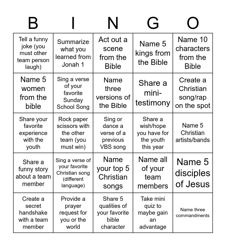 This bingo card has 25 words: Sing a verse of your favorite Christian song (different language), Share 5 qualities of your favorite bible character, Name three versions of the Bible, Create a secret handshake with a team member, Name 10 characters from the Bible, Tell a funny joke (you must other team person laugh), Name 5 women from the bible, Summarize what you learned from Jonah 1, Share a wish/hope you have for the youth this year, Name your top 5 Christian songs, Share a mini-testimony, Share your favorite experience with the youth, Name all of your team members, Name 5 disciples of Jesus, Sing a verse of your favorite Sunday School Song, Name three commandments, Name 5 Christian artists/bands, Act out a scene from the Bible, Create a Christian song/rap on the spot, Rock paper scissors with the other team (you must win), Sing or dance a verse of a previous VBS song, Provide a prayer request for you or the world, Share a funny story about a team member, Name 5 kings from the Bible and Take mini quiz to maybe gain an advantage.