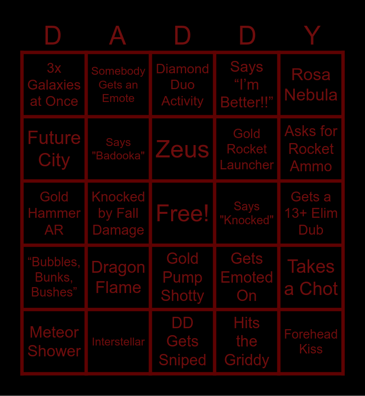 This bingo card has a free space and 24 words: Dragon Flame, Interstellar, Zeus, Meteor Shower, Rosa Nebula, 3x Galaxies at Once, Future City, Somebody Gets an Emote, Says "Knocked", Gold Pump Shotty, Gold Rocket Launcher, Gold Hammer AR, Gets Emoted On, Takes a Chot, Says "Badooka", Hits the Griddy, Gets a 13+ Elim Dub, Diamond Duo Activity, Asks for Rocket Ammo, Knocked by Fall Damage, Forehead Kiss, “Bubbles, Bunks, Bushes”, Says “I’m Better!!” and DD Gets Sniped.